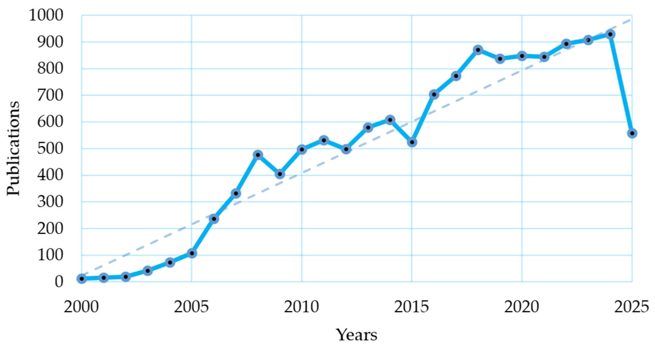 Figure 2 shows the annual distribution of publications from 2000 to 2025 using the broad query described in