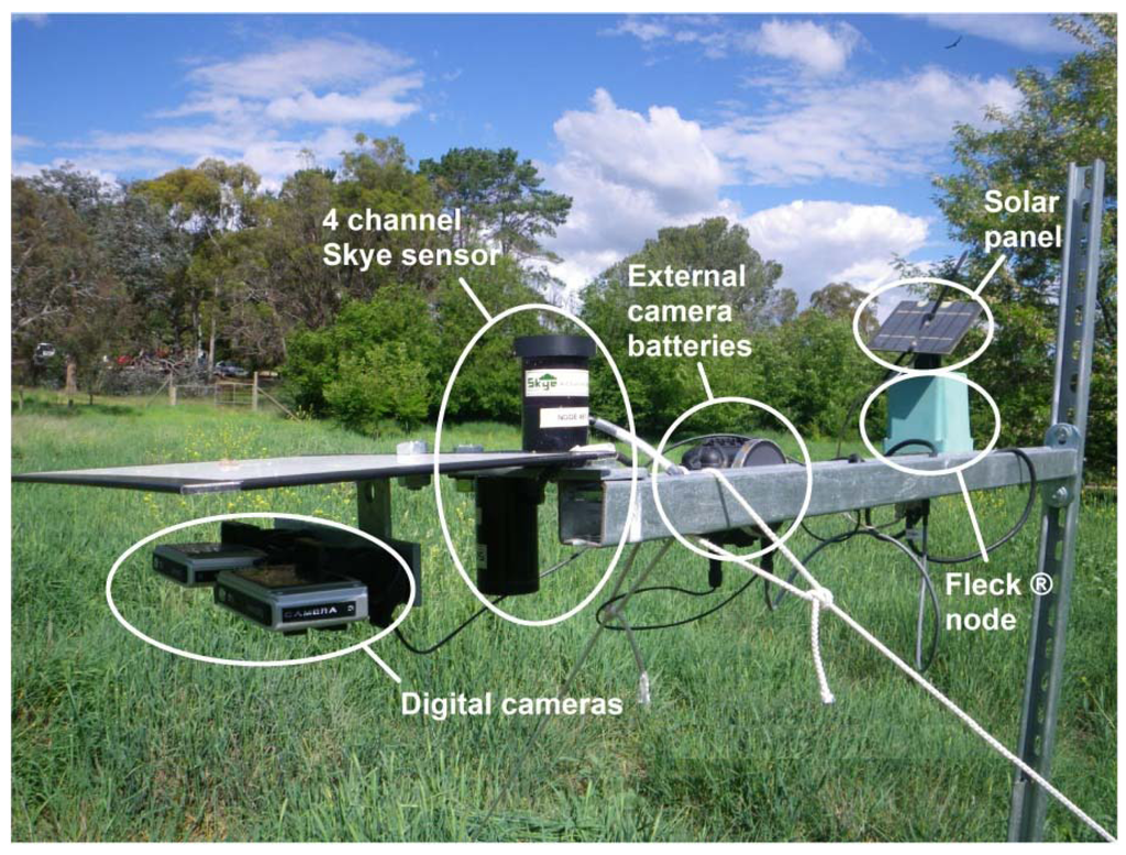 Node with solar powered Fleck®, paired multispectral sensors and digital cameras. Note the cosine diffusion filter is fitted to only the upward-pointing sensor.