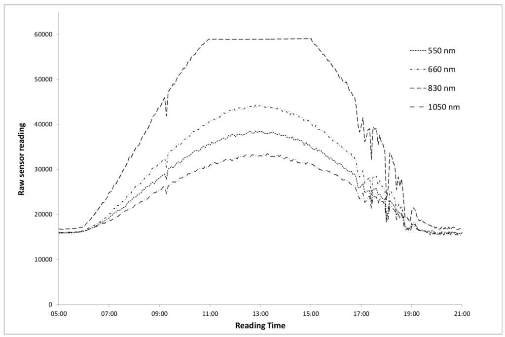 Upward-pointing multispectral sensor readings showing gain calibration issue resulting in clipping of NIR band (830 nm) readings during the middle hours of a summer day (3 December 2009), due to incorrect analogue to digital converter calibration.