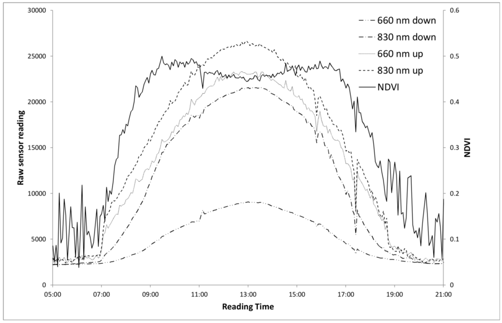 Reflections of solar radiation from water bodies and other bright surfaces, or shade falling differentially over the upward-pointing of the paired multispectral sensors, may interfere with observations. In our study we initially observed an unexpected dip in the NDVI calculations from the multispectral readings during the middle of the day (