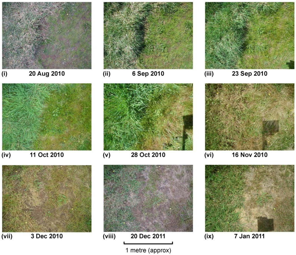 Time-series of images from the RGB digital camera mounted on one of the nodes at the Crace site. Shadows from the node arm can be seen in iii, v, vi, and ix. The 20 mm diameter yellow markers used as GCPs for rectifying images are visible as white dots, but are obscured by grass in some images.