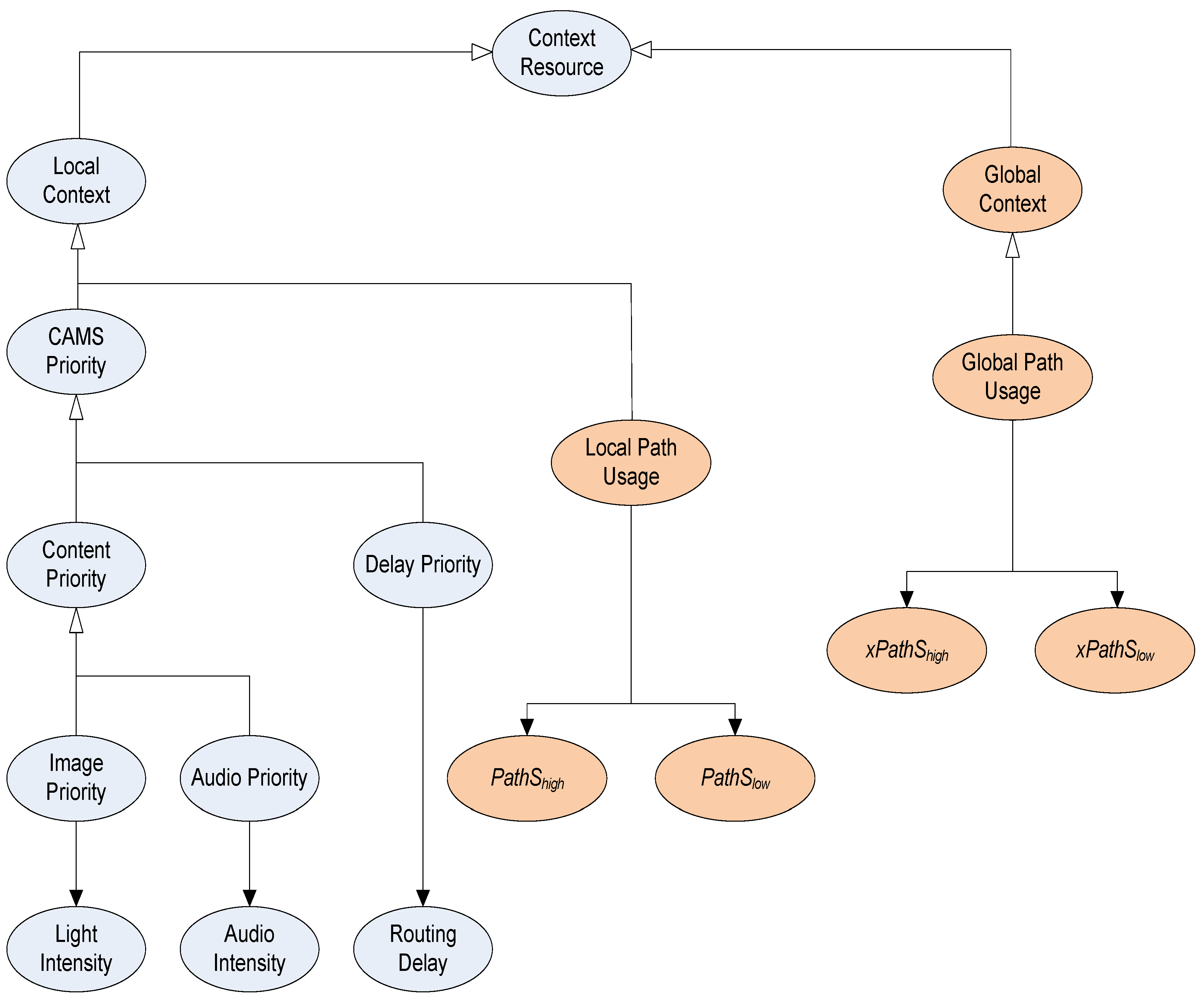 e., CAMS priority. However, it is conceivable that if individual nodes can be made aware of and adapt their behavior to not only their local context, but also the global context of other nodes, a more coherent and optimal management of the network can be achieved. To illustrate the usage of global contexts, CAMS has been extended for nodes to utilize another type of local context (local path usage), which can be shared or exchanged between nodes as global context. Therefore, a new case scenario has been designed and its corresponding context model is shown on the right side of