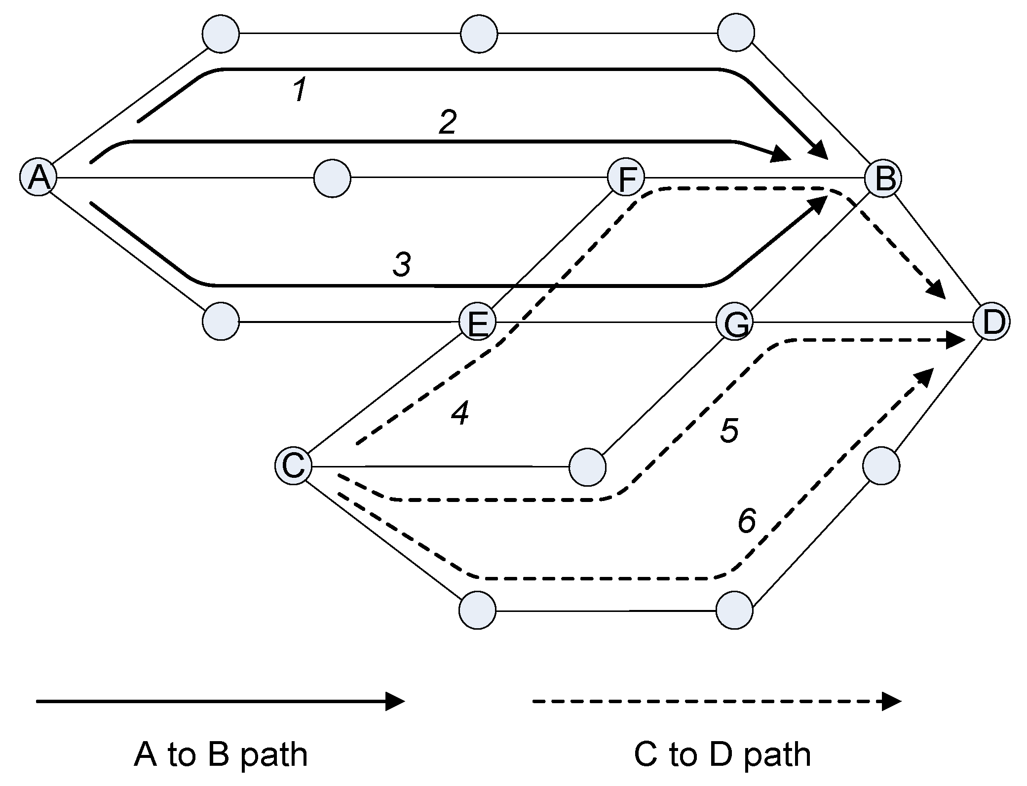 PathSlow depending on whether they satisfy the delay requirement of the high-priority frame, or low-priority frame, respectively. To motivate the need for an improved CAMS, consider the case where multiple source-destination pairs performed CAMS only according to their local contexts, resulting in some node-disjoint paths between different communicating pairs to become ‘node-joint’ or overlapped as shown in