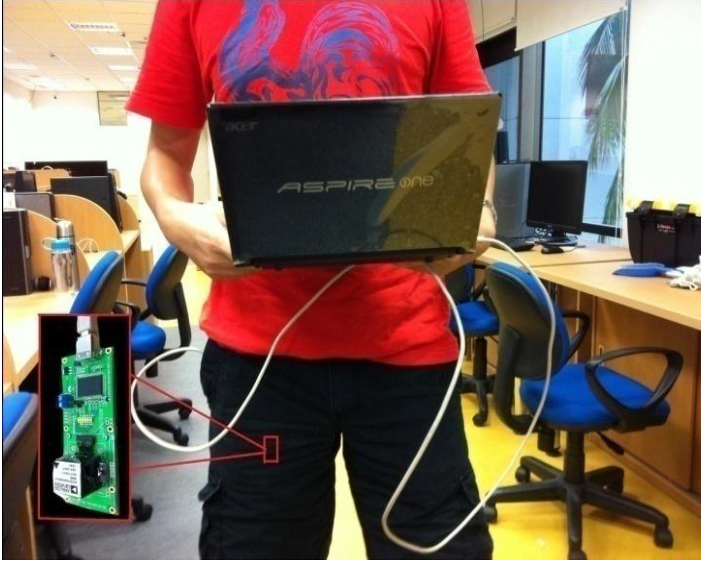 The sensor we use is ADIS16405BMLZ [13], containing a three-axis accelerometer, a three-axis gyroscope and a three-axis magnetometer. To simulate the usage of a smart phone, the sensor is put in a trouser pocket, as shown in Figure 1 for data collection during walking, as many people carry their phones in their trouser pockets [14].