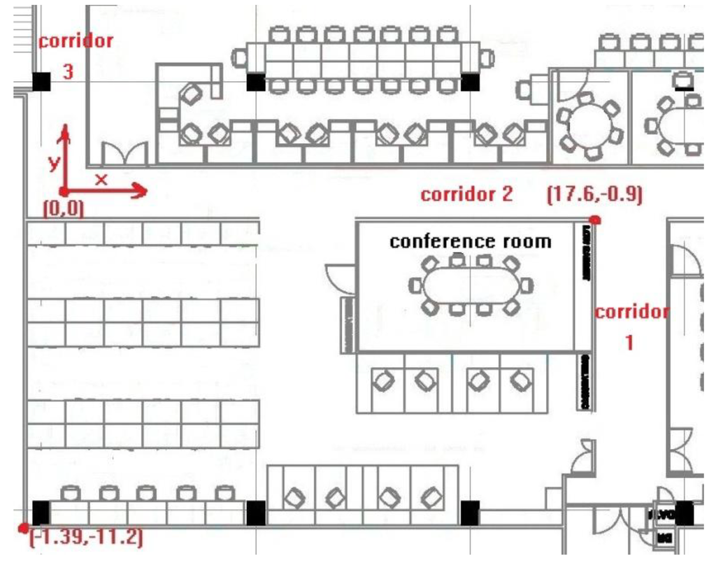 In order to perform the experimental study, our laboratory was chosen as the indoor tracking testbed. The layout is shown in Figure 2. The size of the testbed is about 22 m by 18 m. The coordinate system and the coordinates for some locations are also indicated. The map contains obstacles, walls and accessible areas. There are three corridors available in total in this map for the MM algorithm. Later, the map will be represented as simple lines and rectangles.