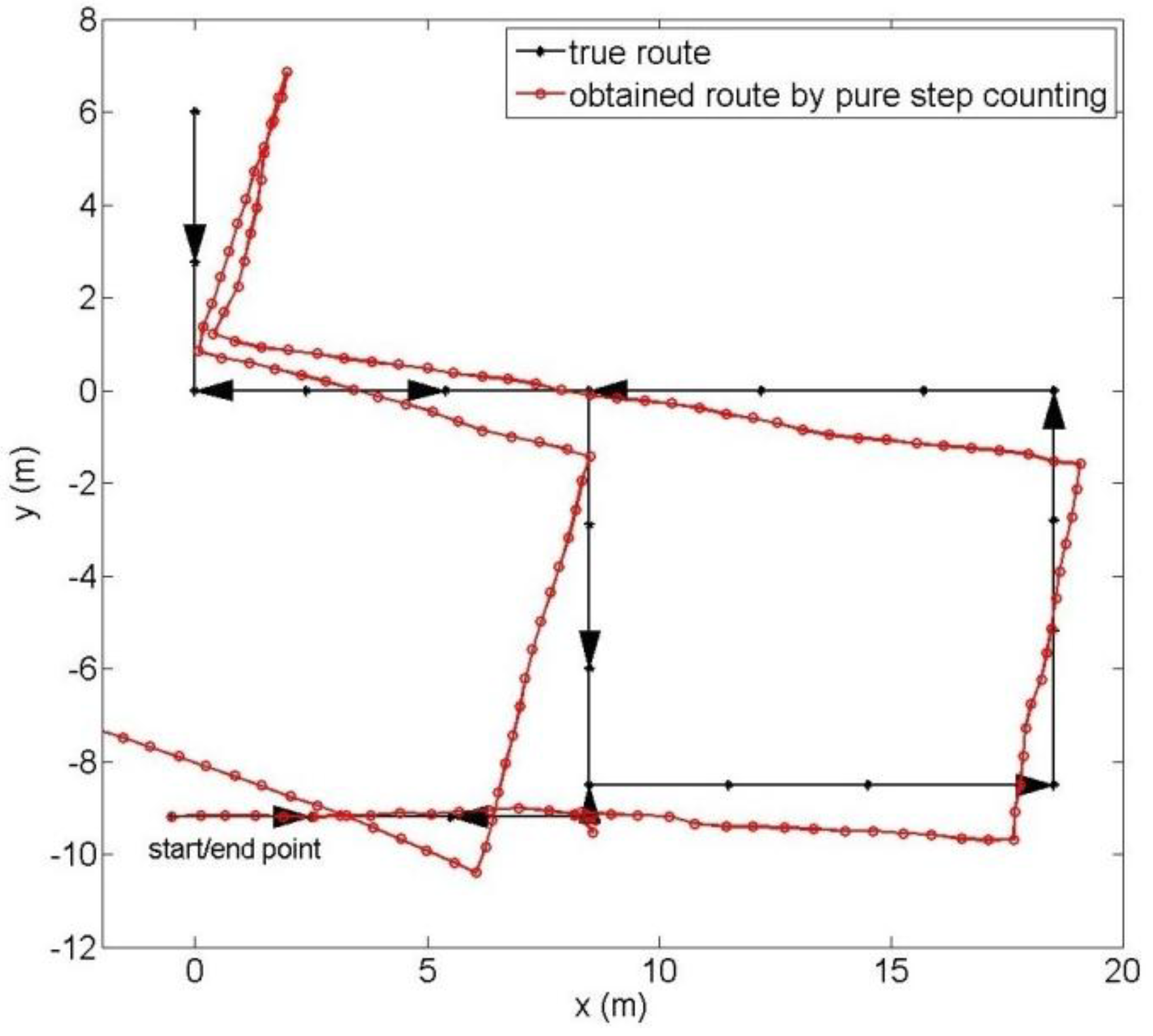 To decrease the cost of deployment, dead-reckoning (DR) techniques relying on inertial measurement unit (IMU) sensors have been proposed [5,6], which have always been applied in GPS systems to improve the robustness of the results. An IMU sensor is able to track its movement by the equipped accelerometers, gyroscopes and magnetometers. The DR method derives the current location by adding the estimated displacement to the previous estimated location. Suppose no external information except the initial location is known; the performance of DR totally relies on the measurement accuracy of the sensors. It is intuitive to find that the DR methods suffer from accumulating errors in the measurements.
