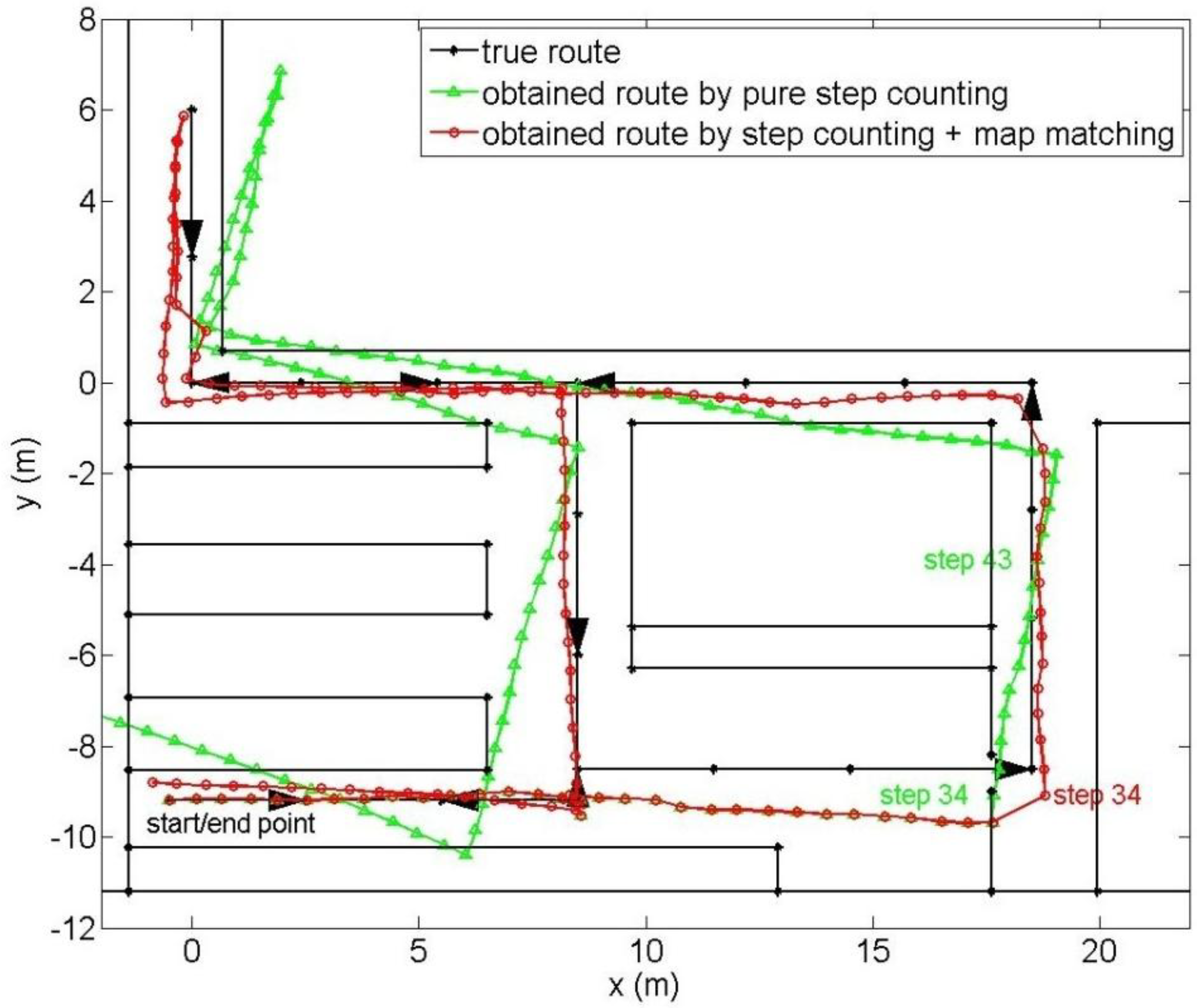 A performance comparison of the pure step counting and the one with MM is shown in Figure 4. There are narrow corridors in the map. At the beginning, MM is not triggered, so both algorithms achieve the same results. After 43 steps, the conditions of MM algorithm are met, and it is triggered. Turning step 34 is found, whose location is then projected to the corridor, as the one stated in red text. The directions from step 34 to 43 are rectified, and the positions are recalculated. Since the sensor’s orientation estimation is also rectified, so the direction estimation after step 43 is also improved.