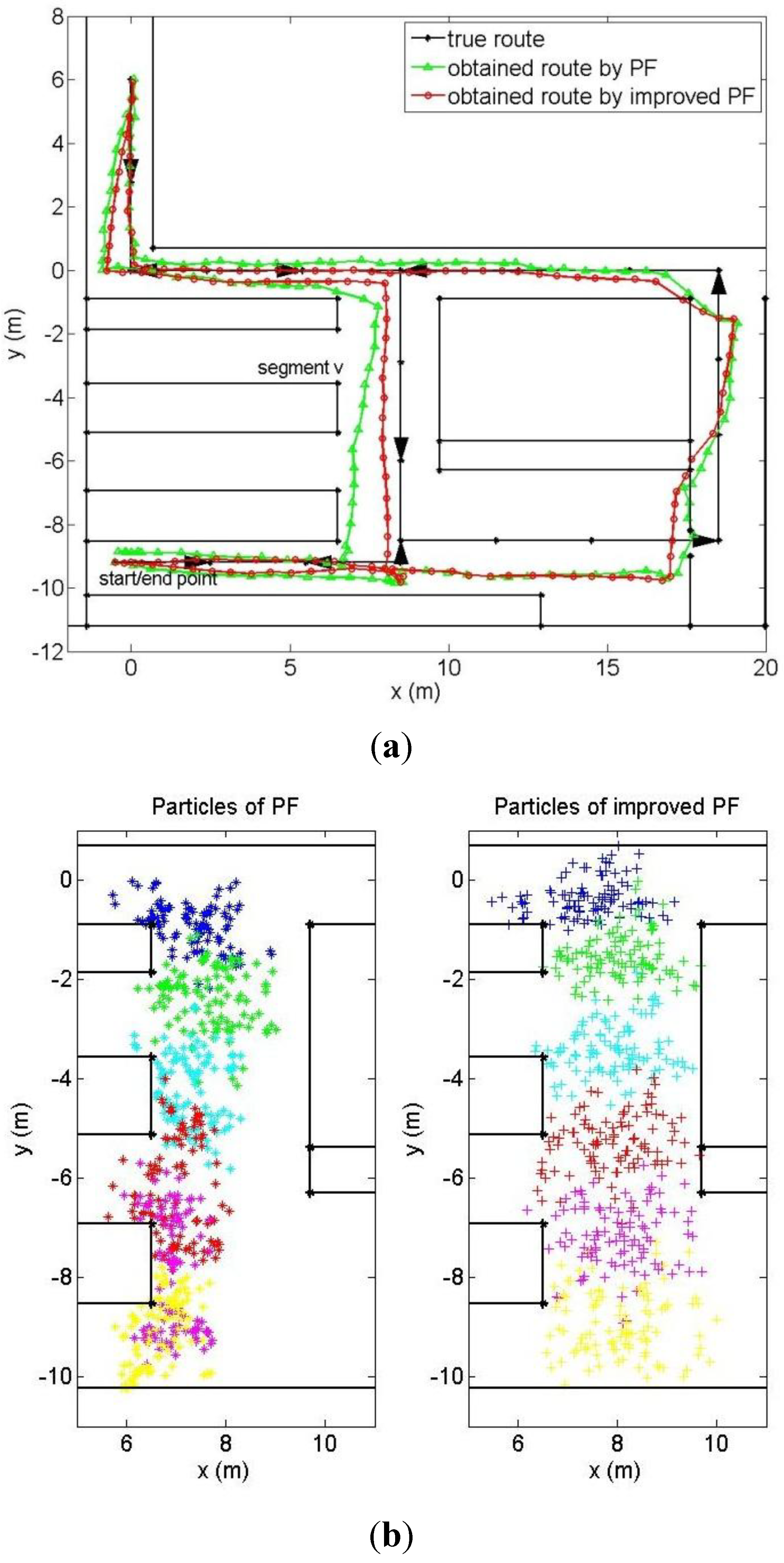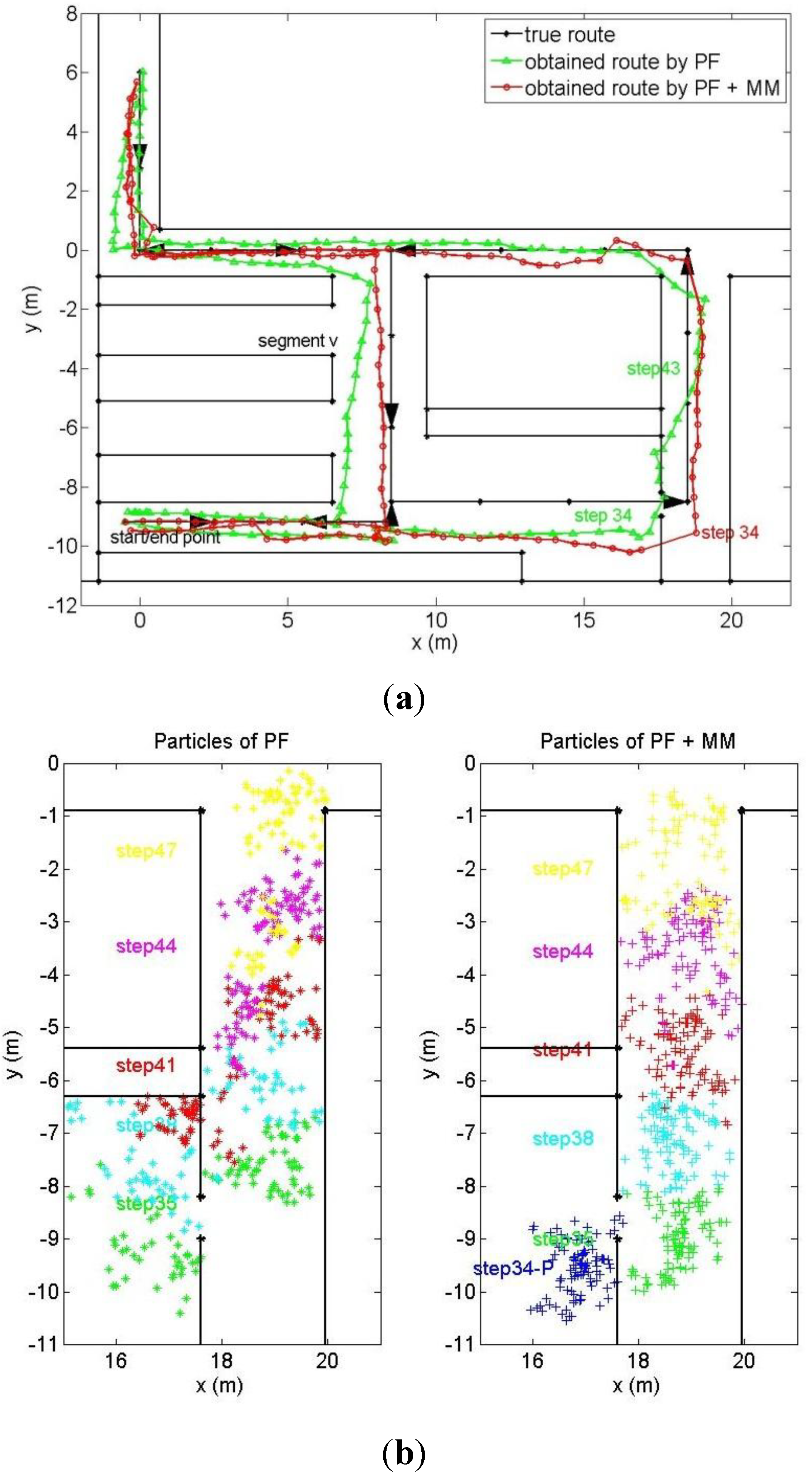 A performance comparison between the original PF and the MM-enabled PF is shown in Figure 5. In the segment v in Figure 5a, there is clear drift for the PF algorithm, because of the error in step direction estimation. A more detailed explanation of the process is shown in Figure 5b, which represents the particles at different steps as dots with different colors. The particles for PF are sparsely distributed, so that there are always particles in the actual location. Although erroneous particles are filtered during walking, there is a trend that the particles drift to the right-hand side. For the PF + MM algorithm, the MM is triggered in step 43, and the particles are recalculated from step 34. The particles at step 34 for the PF + MM algorithm before the execution of the MM algorithm are also represented (step 34-P)). Once the MM algorithm is triggered, all the particles of step 34-P are regenerated in the corridor. The particles at the subsequent steps are recalculated using the rectified direction estimation, as shown in Figure 5b.