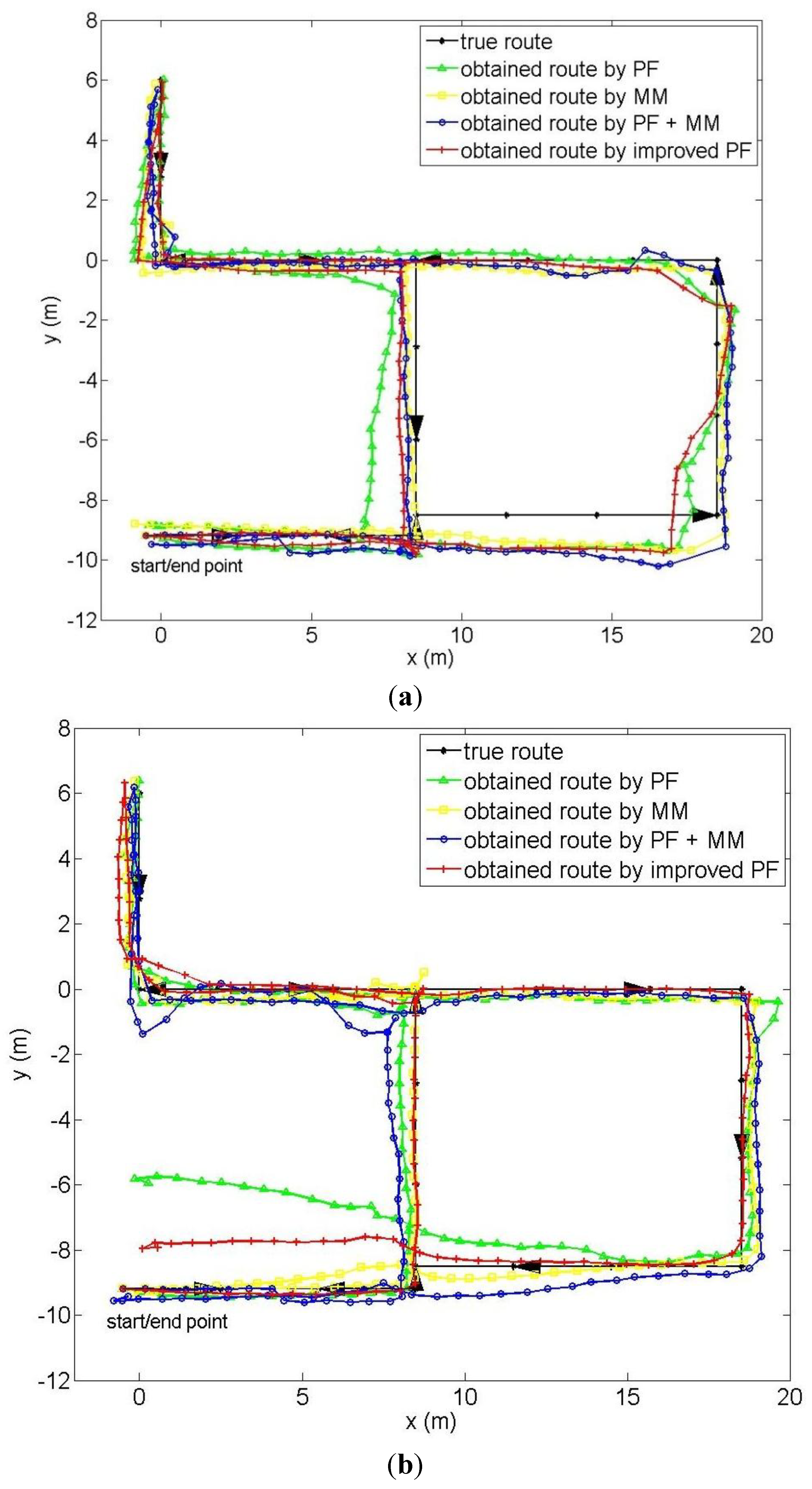MM is triggered only when the pedestrian is in the corridor, which wastes the other map constraints’ information. MM-enabled PF is quite a natural method to retain the advantages of both algorithms. Our improved PF takes advantage of PF and improves direction estimation at the same time. In the next section, when less corridor information is given, we will see the improvement of such algorithms.