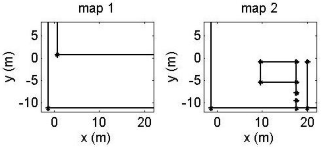 Previous evaluation has been carried out in an ideal corridor environment, like our lab. It is necessary to test the performance in another scenario. In this paper, the new scenario is virtually created by giving incomplete map information to the algorithms. From the algorithms’ perspective, it makes no difference compared to collecting the data in a physical new environment and using relative map constraints. Figure 8 shows the incomplete map we use to evaluate the performance for the same routes in Section 6.1. Map 1 keeps the map constraints in the top left corner, with one wall of a horizontal corridor. Map 2 keeps the map constraints in the bottom right corner, with the conference room.