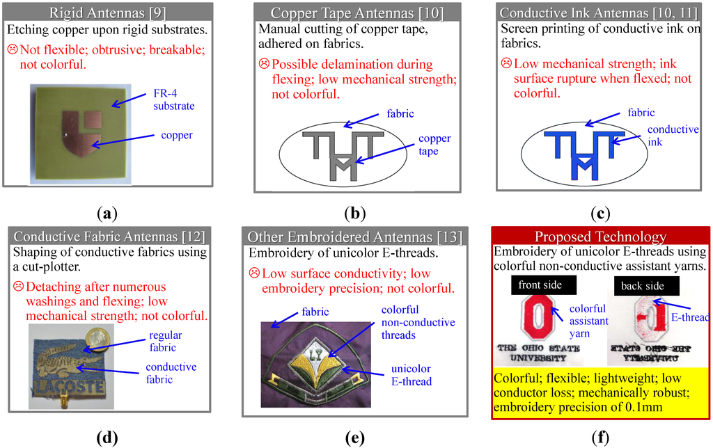 Former technologies used to realize wearable logo-shaped antennas: (a) rigid antennas © John Wiley and Sons [9]; (b) copper tape antennas [10]; (c) conductive ink antennas [10,11]; (d) conductive fabric antennas © IEEE [12]; (e) other embroidered antenna © IEEE [13]; versus (f) proposed technology.