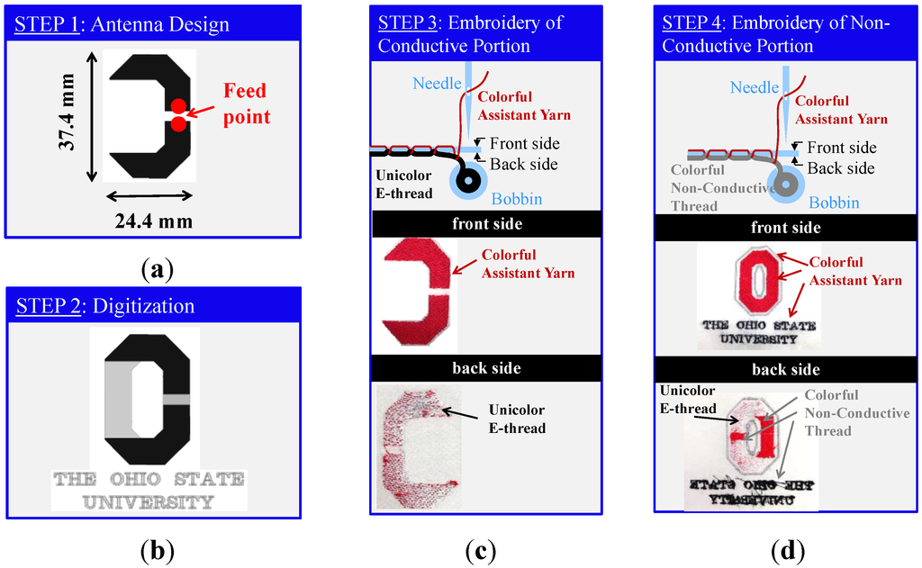 Proposed technology for colorful logo antennas: (a) STEP 1: antenna design; (b) STEP 2: digitization; (c) STEP 3: embroidery of conductive parts; (d) STEP 4: embroidery of non-conductive parts.