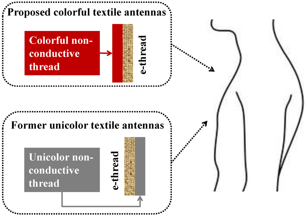 Wearable devices are of growing interest for several applications, including wireless communications, Radio Frequency Identification (RFID), sensing, etc. [1,2,3,4,5]. As would be expected, these wearable devices require antennas that are flexible, conformal, and robust to withstand daily wear and repetitive washing/drying. In the past, we demonstrated embroidery of conductive threads (e-threads) to realize textile antennas that address the aforementioned challenges [6,7,8]. The employed e-thread consists of a twisted bundle comprised of 7–600 metal-coated polymer filaments. This implies that the e-threads are unicolor as attributed to the corresponding conductive material. That is, they are silver-colored if the conductor coating is silver, and copper-colored if their conductor coating is copper. Thus, they cannot be employed to ‘print’ colorful textile antennas.