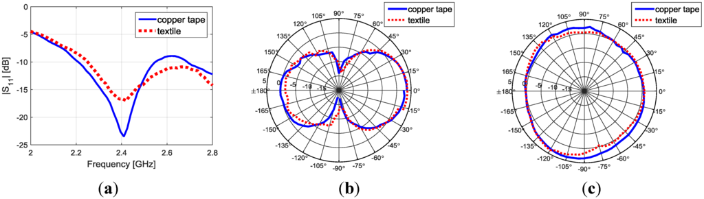 The measured reflection coefficient, |S11|, of the textile and copper antennas is given in Figure 4a, indicating good agreement. The corresponding measured realized antenna gain patterns at 2.4 GHz are shown in Figure 4b (E-plane) and Figure 4c (H-plane). As seen, excellent agreement is achieved.