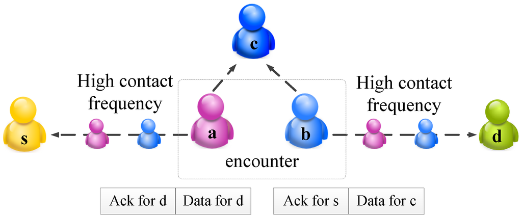 Since the MSN is an autonomous network, a proper incentive scheme is imperative to stimulate nodal cooperation and to attract more participants. Without the centralized communication scheme, to apply incentive mechanism in MSNs, a common method is to collect the acknowledgment from the destination [3,4,5,6]. That is, the relays can inject information into the message. After the data reaches the destination node, the destination node will send the forwarding list, as an acknowledgment, back to the source. That is, there exist two types of messages in the network. In real scenarios, the buffer of the node is usually limited [7]. Therefore, how to utilize the limited buffer space to maximize the message delivery is the motivation of this paper. Ideally, we have two objectives: the data should be disseminated to the destination quickly, and acknowledgment should be sent back quickly. It might not be possible to achieve these two objectives at the same time. Then two challenges arise naturally: (1) How can a node compare the benefits of keeping the message and the benefits of exchanging it with others? (2) How can the benefit gain for each buffer exchange be quantified? The benefit can be regarded as the smaller delivery delay, or higher delivery ratio, and so on. An illustration of the two abovementioned challenges is shown in Figure 1, where nodes a, b have larger contact probabilities with node s and d, respectively. Thus, the acknowledgment for node s should be forwarded to node a, and the data and acknowledgment for node d should be forwarded to node b. However, sometimes, it is not easy to evaluate the nodes’ contact frequency with a special destination. In Figure 1, it is hard to compare the delay from nodes a to c and the delay from nodes b to c. Therefore, whether node b should keep the data for c is non-trivial. Furthermore, if we assume each node can only carry two messages at most, if the node b keeps the acknowledgment for c, the two messages for node d in node a cannot be forwarded to node b, due to the limited buffer space.