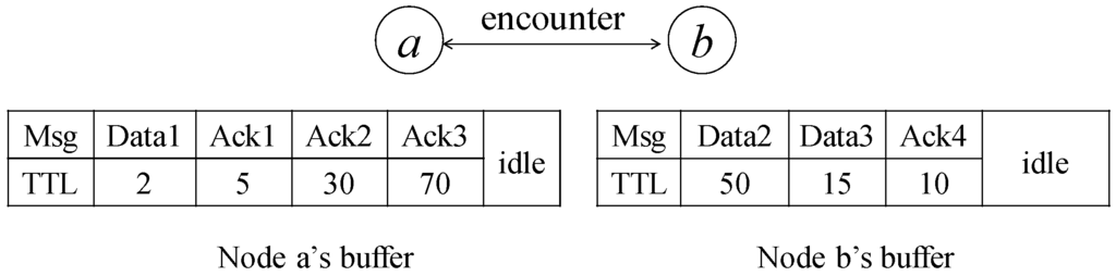 where the is the TTL of message a. The idea is that is the remaining time for message a, and thus we should set a lower priority for messages which have a long remaining time. However, the expected delay has an influence on the priority. For example, though the remaining time of message a is smaller than message b, the expected delay of message a is much smaller than that of message b. In this case, message a should have a lower priority since it can reach the destination before the deadline in a high probability. Thus, leverages the expected delay and the remaining time to represent the priority of the message. If the remaining time is smaller than the expected delay, we should set the priority of the message as 0, since it is highly possible that this message cannot reach its destination before the deadline, so that we do not waste the precious contact opportunity.