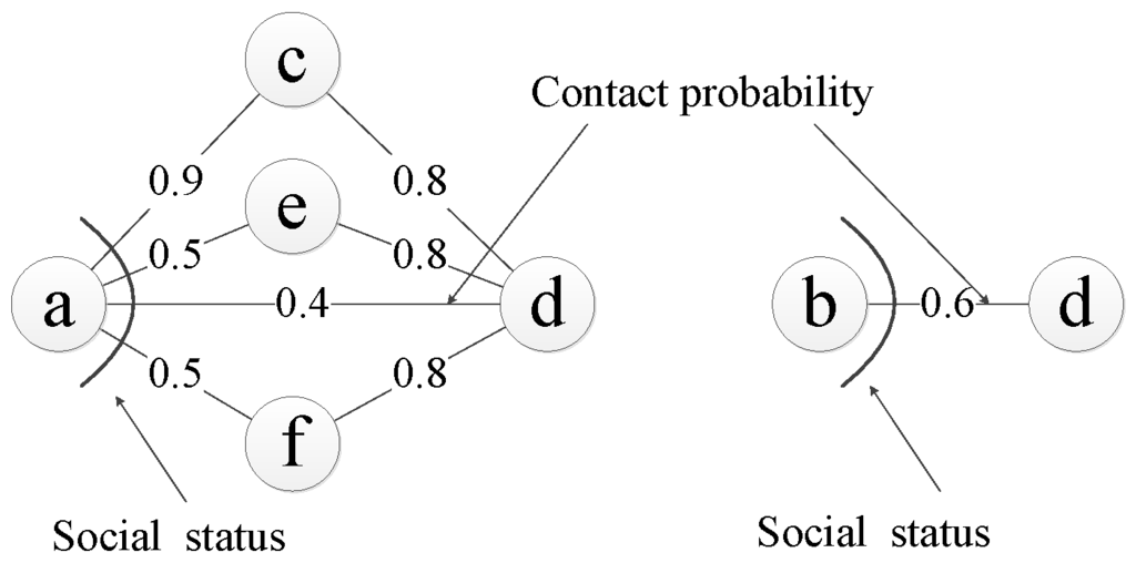 Let us take Figure 3 as an illustration. Consider nodes a and b, whose probabilities of reaching destination d is and respectively. Though the contact probability between node b and destination node d is larger than that of node a, node a should not forward the message to node b for the following two reasons: (1) Node a has a high indirect contact probability with node d. The probability that node a sends a message to d from node c is . (2) Node a has a high probability of meeting other nodes, and has a high probability of reaching the destination. The probability of node a meeting at least one of node e and f is . The probability of sending a message from node e or f is also . From this example, the observation is that the weakly connected relationship with the destination has an influence on the routing decision. That is, if a node is popular, even this node does not have a high contact probability with the destination, this node can still meet other nodes, which have quite a good relationship with the destination. If the current node always forwards the message to the encounter node based on the contact probability, without considering the weakly connected relationship with the destination, it might not be a good strategy. In the following, we use the contact probability and the social status to represent the strong and weak relationship with the destination.