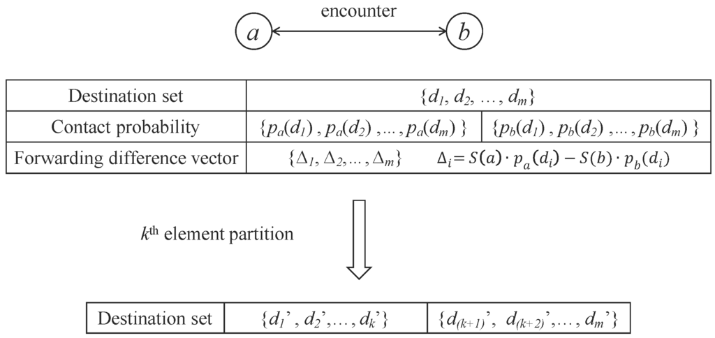 The destination set splitting is based on the ratio of two encounter nodes’ forwarding difference vector.s That is, each node keeps the destination set that has better forwarding ability.