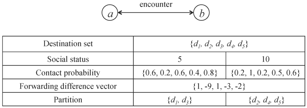 Let us take Figure 5 as an example to illustrate the compare-split scheme. From the top of the figure, you can get the contact probability and social status of nodes a and b. During the contact, node a and node b first exchange the corresponding probability vectors. Node a sends probability vectors , , , , to node b, and node b sends probability vectors, , , ), , to node a. Then, both nodes form a destination set D, . In this example, we choose node a’s view to calculate the forwarding difference vector, is , and the remaining number of destinations are . Then, we will split messages of node a and node b. That is, node a should keep the messages for destination and node b should keep the messages for destination to maximize the combined probability.