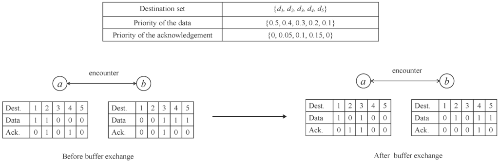 We can illustrate the priority-based compare-split scheme in Figure 6. It continues the aforementioned example in Figure 5. The left-bottom table in Figure 6 shows the buffer information of nodes a and b before the split, where the value represents how much data or how many acknowledgments are destined to the corresponding destination. We consider the buffer constraint to get the number of messages that can be exchanged in each message. Then, we calculate the priority of the data and acknowledgment by Equation (4), and get a total dissemination order of the data and acknowledgment for nodes a and b. We further assume the size of the data is the same with the size of acknowledgment in this example for explanation simplicity, and each node can carry 4 messages at most. According to the compare-split step, node a has three messages to exchange, and node b has 2 messages to exchange. Due to the buffer constraint, only the two messages with the highest priority of each node have an opportunity to exchange in this encounter. For node a, that means the data to destination 2 and acknowledgment to destination 4. As for node b, that means the data to destination 3 and the acknowledgment to destination 3.