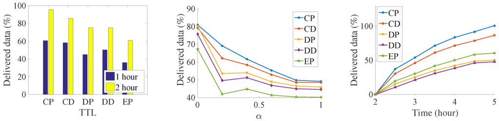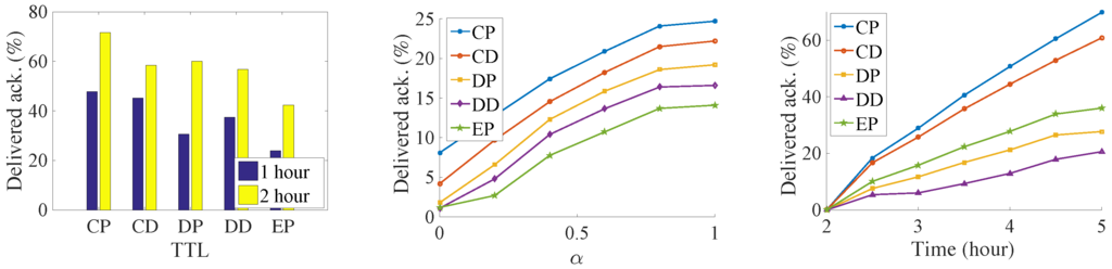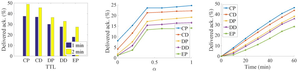 We try to find the influence of the TTL for the delivery ratio, so we increase the TTL of the messages. Both the delivery number of data and the acknowledgment increase with an increase in data’s TTL. It is because that, along with the increasing of data’s TTL, data has a larger opportunity to be delivered before their deadline. At the same time, more acknowledgments are also generated. As a result, more acknowledgments are sent back to their sources. It is a near-linear increase in the Infocom2006 trace with the increase of the TTL. For the synthetic trace, the delivery number increases very quickly before convergence. Then, all the messages are sent to the destination when TTL is large. Any further increase of TTL is meaningless but consumes more buffer resources. Among the five algorithms, the CP algorithm always has the best performance. It is followed by the CD, DP, DD, and EP algorithms. The proposed method delivers 33% data and 22% more acknowledgments than the DD algorithms do. The EP algorithm achieves the worst performance; since lots of message are generated, the old message is soon dropped.