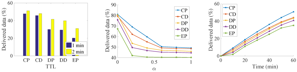 The results can be seen from the Figure 7, Figure 8, Figure 9 and Figure 10. Since we set the same data generation ratio, the message delivery number can be used to represent the delivery ratio in our simulation.