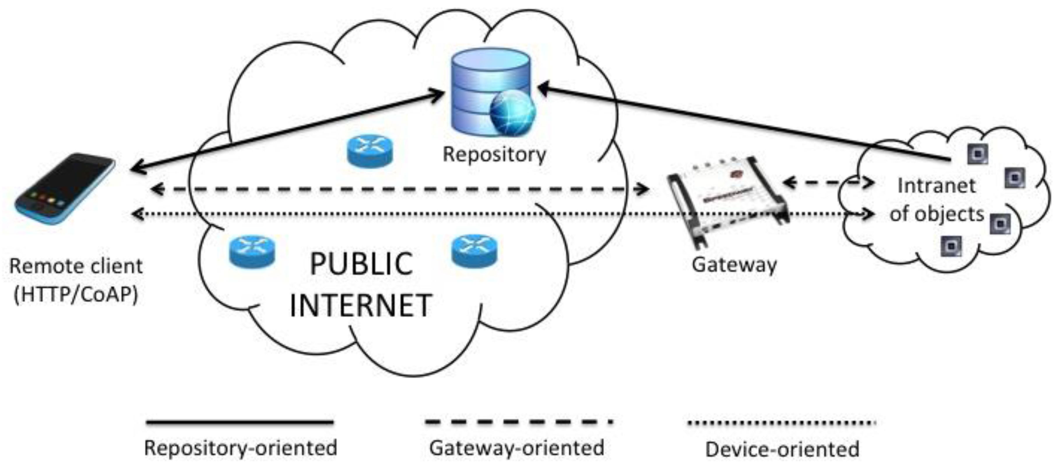 A different approach, named “gateway-oriented”, foresees that the user explicitly queries a server that offers a predefined set of APIs (Application Programming Interfaces) to access the resources of the legacy devices. The gateway is typically located at the edge of the network and translates standard Internet protocols into proprietary protocols. This approach enables real-time interaction with the device, although the client needs to explicitly address its requests towards a third entity like the gateway. A further benefit is the opportunity to demand of the gateway efficient query processing, such as generating average, maximum and minimum values of the data produced by devices.