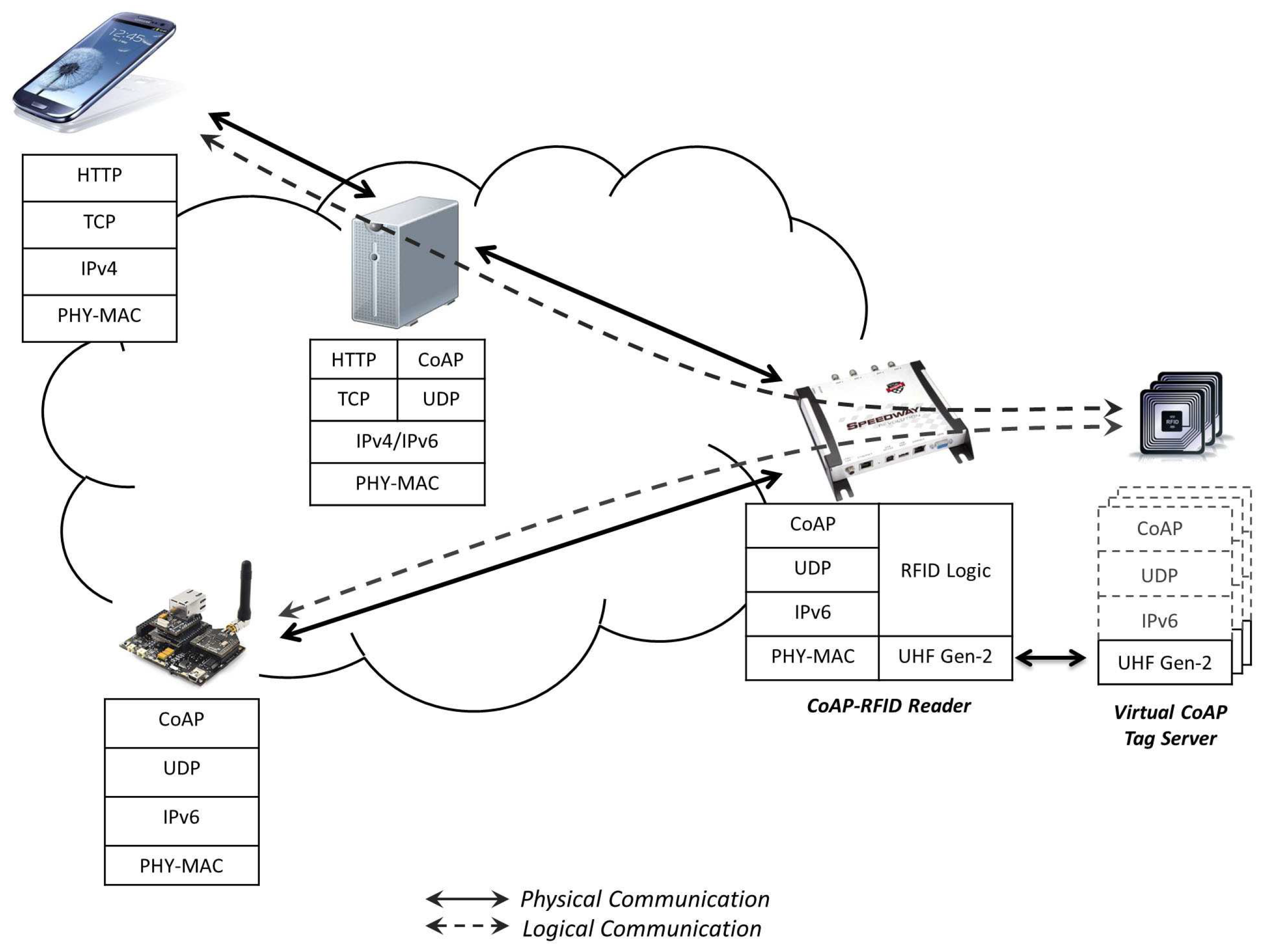 37], since they can participate in Internet communications only with the help of more powerful devices (i.e., RFID readers), acting as proxies or gateways, and are unable to host a protocol stack specifically designed for constrained nodes (e.g., CoAP over UDP).