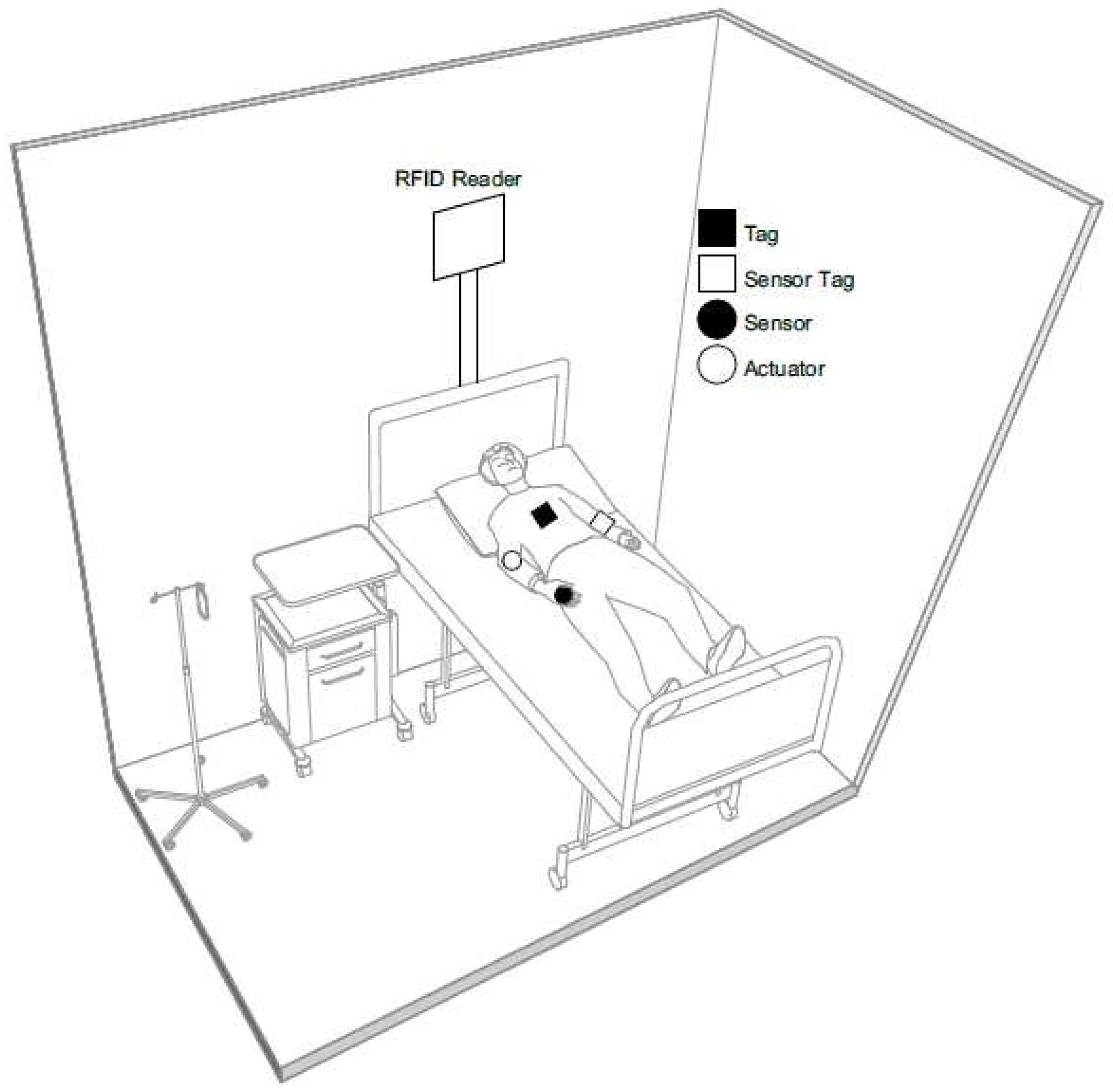 In the considered scenario, we assume that a fixed RFID reader is installed in a hospital room and manages tags on the body of the patients located in the room. Nowadays, fixed readers typically support multiple antenna transmissions, so that a single device can cover a small environment, such as a room of a hospital with many patients’ beds. Readers can be connected to the Internet/intranet and be accessible from clients (such as the smartphone or the desktop computer of a medical practitioner) using different connectivity means (e.g., Ethernet, Wi-Fi, cellular network). We consider this solution viable and cost efficient for a number of reasons. First, the continuous technological advancements in RFID technologies has been making the deployment cost of commercial RFID readers lower and lower. Second, using simple passive tags instead of more capable sensor nodes or sensor/actuator-equipped RFID tags to provide storage functionalities and record patient’s personal health profile lowers manufacturing and maintenance costs due to the additional electronic components and periodic battery replacement that more advanced devices would require.