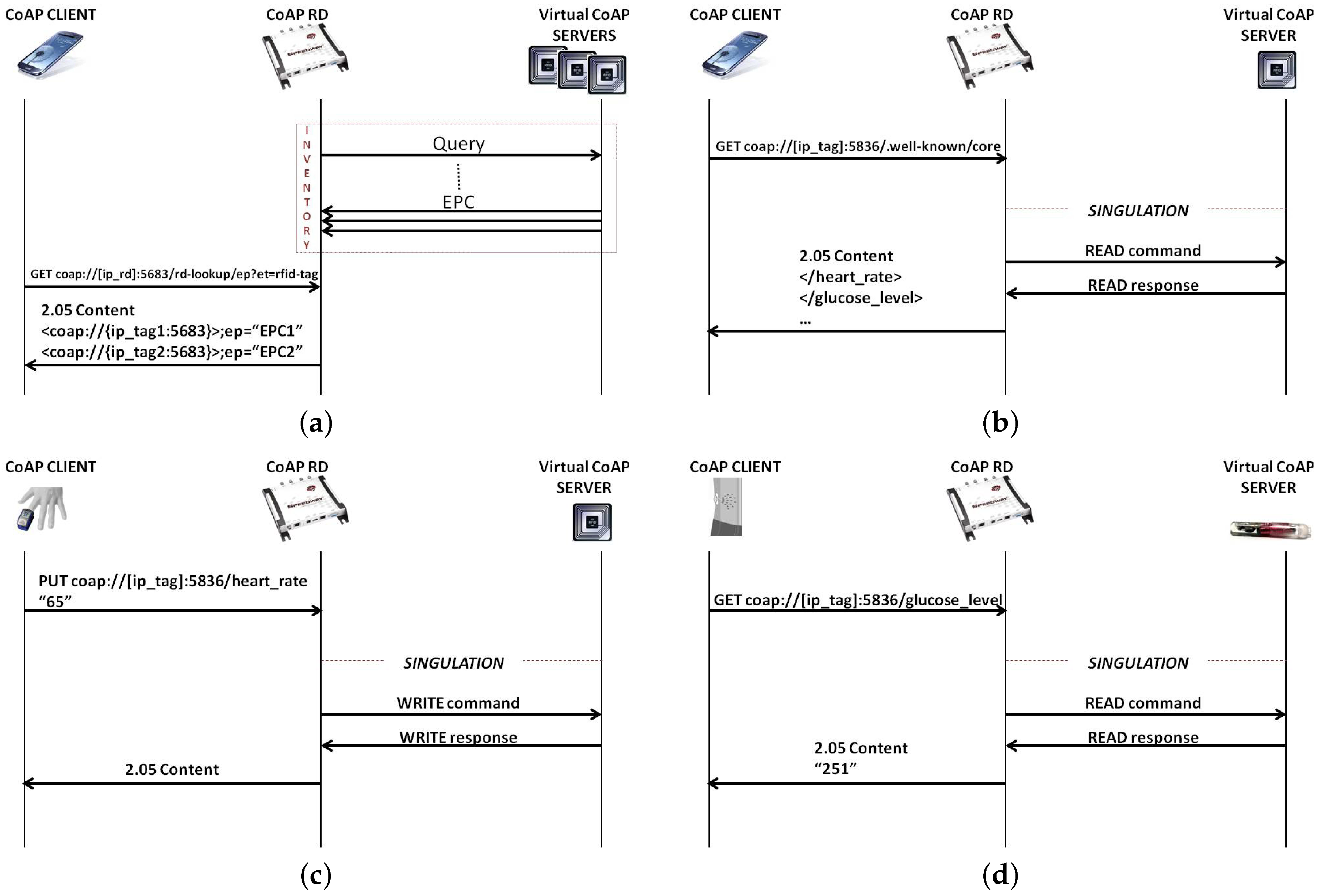 Figure 4c depicts this kind of M2M communication. In particular, the sensor will send a PUT request to the CoAP virtual tag, which will invoke a Write command on the tag’s user memory by the reader.