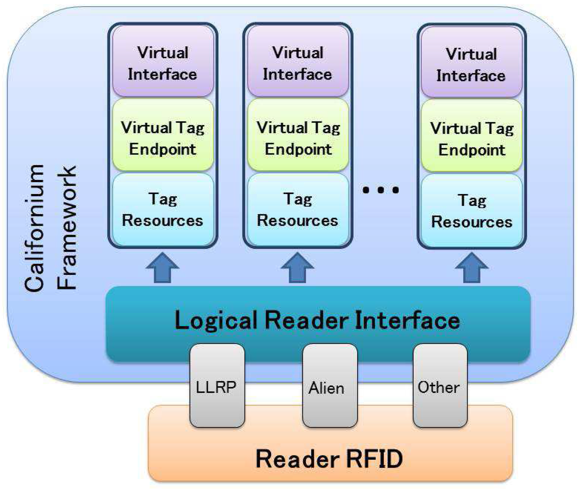 Figure 5 illustrates the overall system architecture. First of all, we have extended Californium to support RFID operations, such as inventory, reading and writing. We provided a set of common APIs, defining a logical reader interface, that guarantee an abstraction layer from the communication interface of the RFID reader. In this way, our platform can be directly executed on a RFID reader (or on a server with a direct connection to the RFID reader), by implementing the appropriate protocol compliant with the logical reader interface. For instance, the RFID reader can be controlled by using the standardized LLRP protocol or vendor protocols.