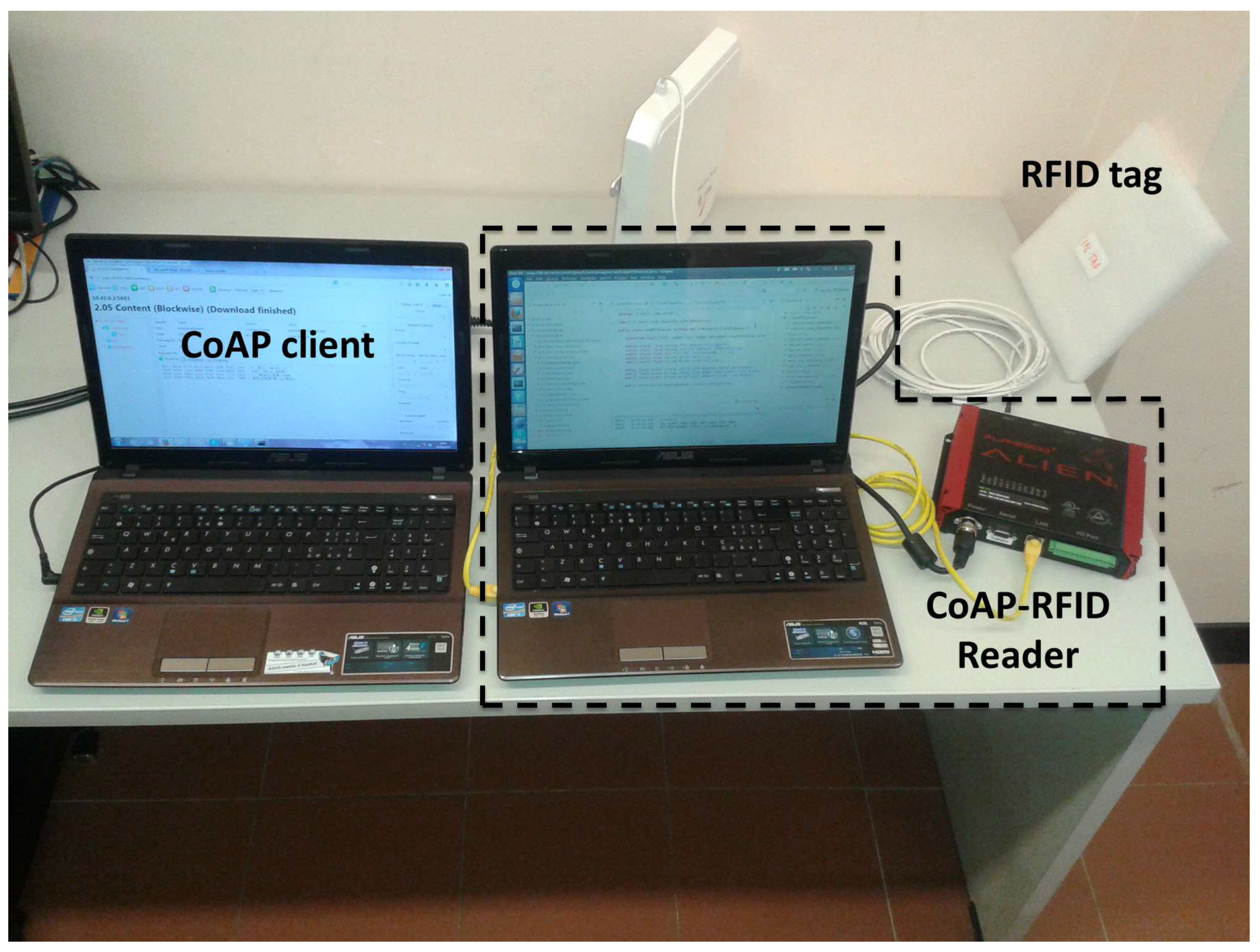 Moreover, we use UHF Impinj Monza tags, equipped with an EEPROM user memory of 512 bits. The CoAP client is running on a different workstation with features analogous to the other laptop, with which it communicates via a wireless IEEE 802.11 connection. The testbed is outlined in