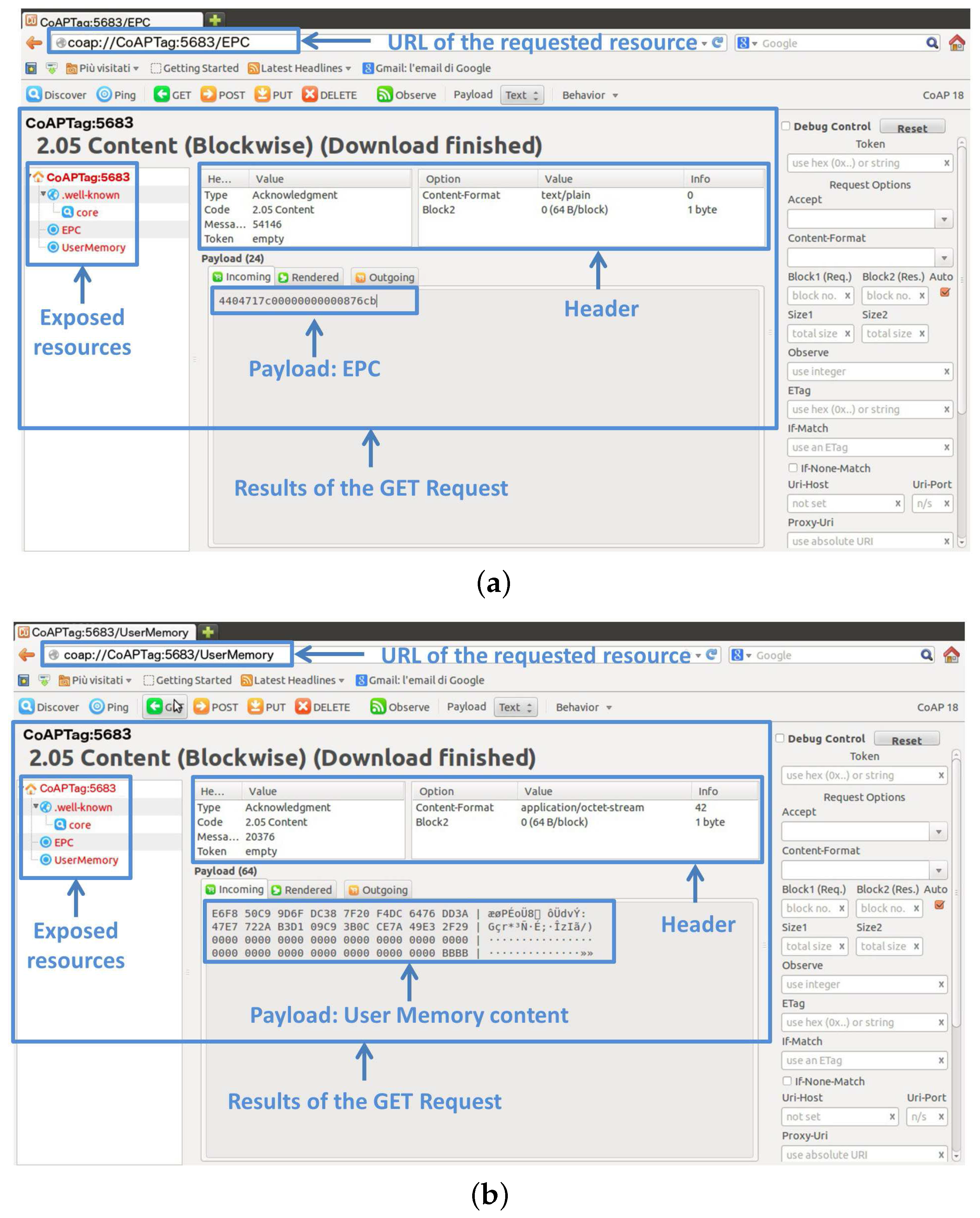 Figure 7b, we show the result of a GET request to the user memory resource, whose content is presented in hexadecimal format. Furthermore, the Copper interface allows one to graphically investigate the main fields of the messages involved in the CoAP request-response interaction.