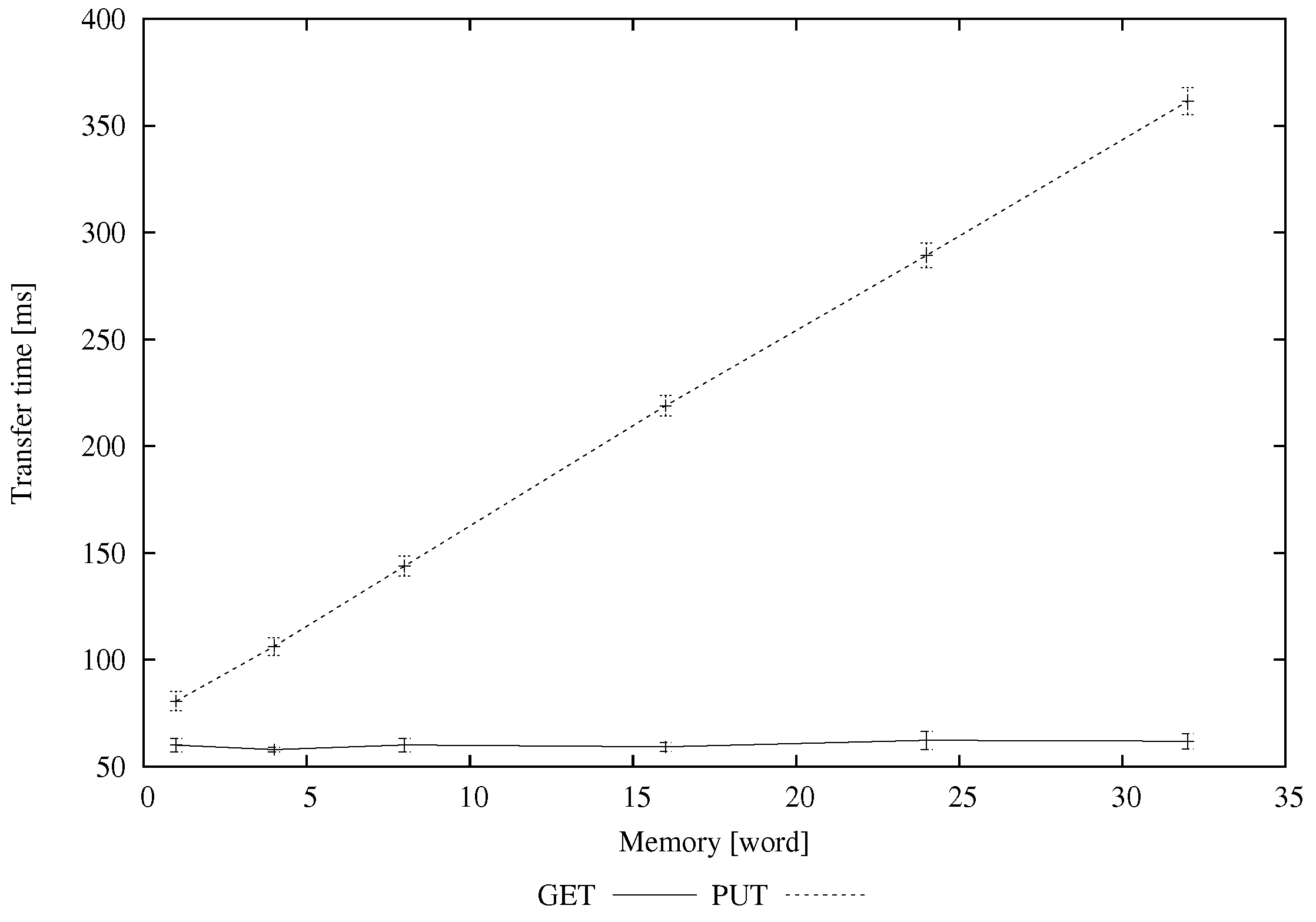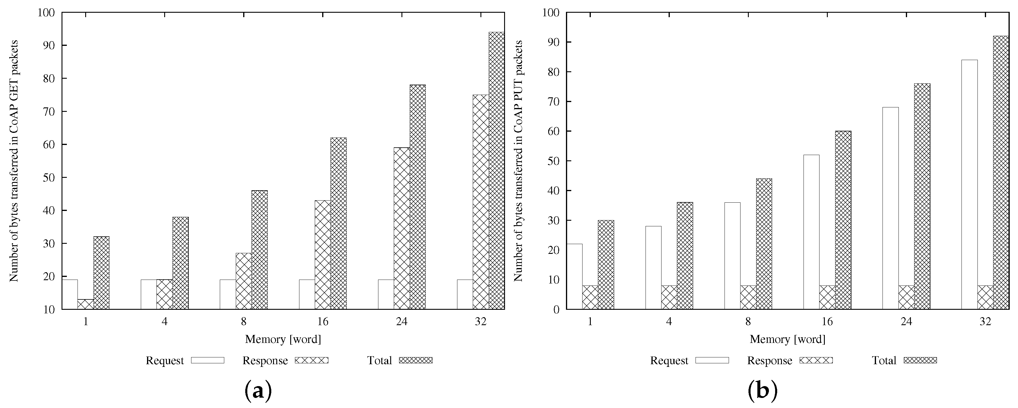 Figure 9, we plot the size of the packets at the CoAP level for GET and PUT operations, explicitly reporting the details of both request and response messages. The figures highlight that the total amount of transferred bytes is similar in the case of the GET and PUT operations, but Request and Response messages have different sizes in the two cases. In particular, the dimension of the Request message for a GET operation is constant (it contains only the header), while the size of the Response message increases when the dimension of the user memory grows (it carries the content of the user memory). These considerations can be inferred by looking at