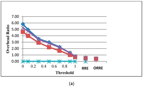 Overhead ratio for Threshold, RRE, ORRE for (a) pigeon and (b) flying fox scenarios.