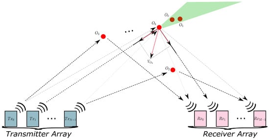 An abstract depiction of the bistatic sonar nature of our proposed deep underwater multiple object tracking scenario is given in Figure 1. Under the MIMO assumption, we can express each received signal  as the sum of L copies of each transmitted signal , time delayed by , shifted by its respective Doppler frequency  and scaled by an attenuation factor .