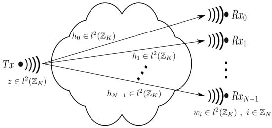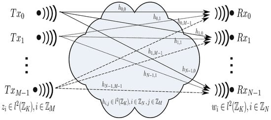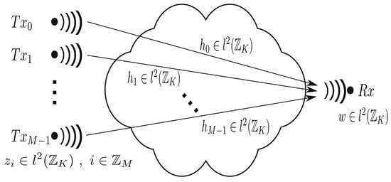 where  is the i-th transmitted signal,  is the i-th impulse response,  is the received signal,  is the cyclic convolution operator of order K, ⨆ is the horizontal matrix concatenation operator, ⋁ is the vertical matrix concatenation operator,  is the input channel matrix,  is the impulse response channel vector and  is the circulant operator. Figure 4 illustrates the MISO channel model system. A matrix-vector representation for this model is shown in Equation (10).