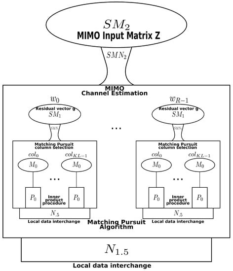 Kuck’s approach creates a hierarchical structure to represent in a parallel manner the execution of an algorithm. This hierarchical structure reflects the connection between the computing units and shared memory stages. Each level is tagged with a specific label, like “1.5”. This representation approach is sufficiently abstract to allow implementations in a wide spectrum of modern architectures. Figure 6 illustrates Kuck’s diagram representation of the parallel MIMO ALS estimation problem []. In this figure, Level 0 represents independent memory units,  and uniprocessors , which contain registers and caches for fast access to frequently-used data. At level , these units are interconnected with a network , generally a bus, mesh, hypercube, shuffle or other mechanism of data interchange. This network provides communication between processors, but does not provide shared memory. Therefore, a protocol for message passing is necessary. The first level of shared-address memory space is . The communication between the processors in Level 0 and  is managed by . There exists a great difference between direct access to memory via  and indirect access to memory via . The difference is appreciated in the poor performance produced by the indirect access to memory. Now, we can apply a recursive principle to generate new levels.