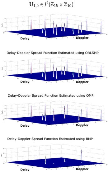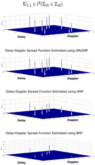 The MIMO channel configuration used in our testbed experiments is presented in Figure 7. Our experimental results show that the order recursive least square matching pursuit (ORLSMP or OLS, for short) algorithm performs best for MIMO channel estimation. Figure 8 and Figure 9 depict the result of MIMO channel estimation simulations using the three matching pursuit algorithms previously discussed. In each figure, the first graph, from top to bottom, is the given delay-Doppler spread function  for each MIMO channel link to be estimated. The next graph shows the result of the MIMO channel link estimation using the ORLSMP algorithm, demonstrating its best performance by identifying all tracking objects. The graph that follows shows the results of the orthogonal matching pursuit (OMP) algorithm, which is unable to track all moving objects. Finally, the last graph in each figure shows the results of the basic matching pursuit (BMP) algorithm, which runs very quickly; however, it exhibits a very poor moving object tracking performance.