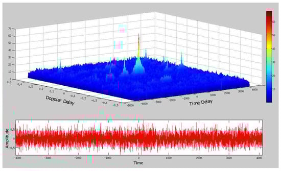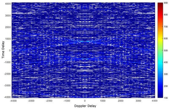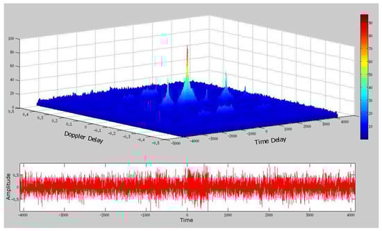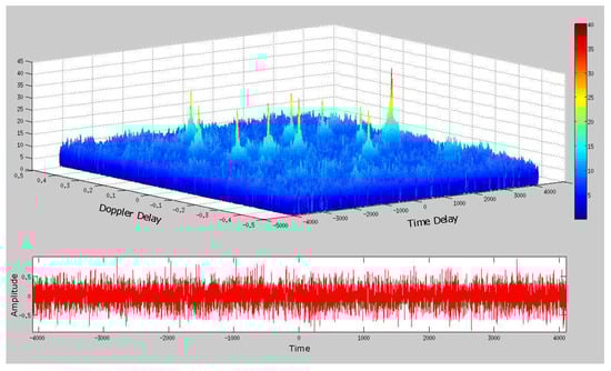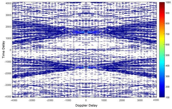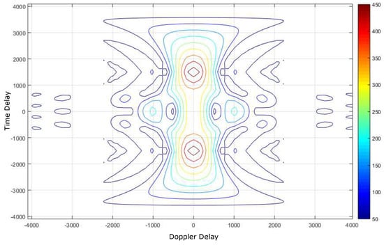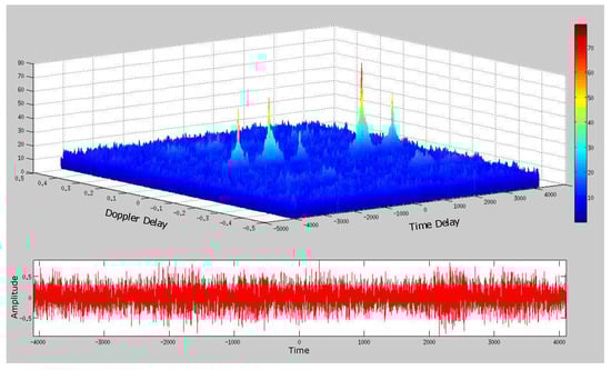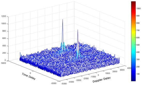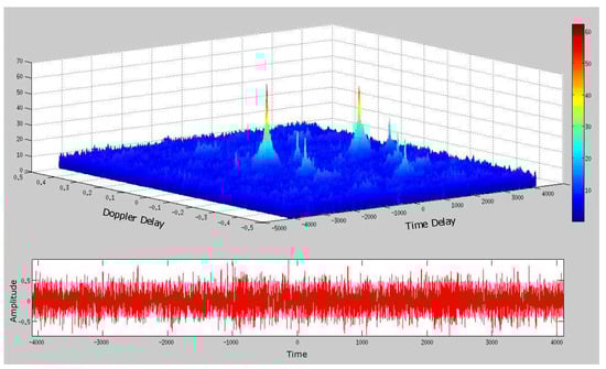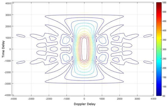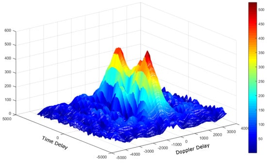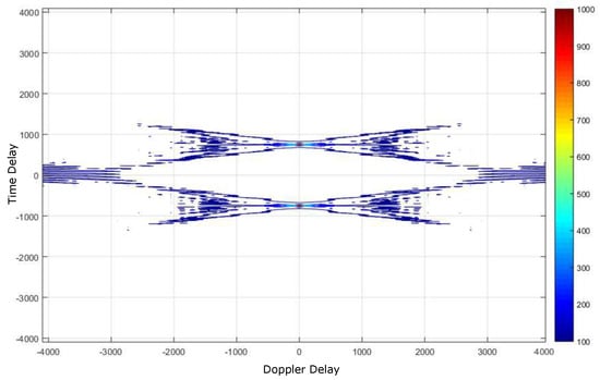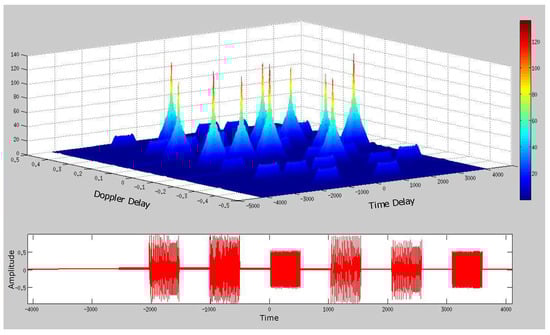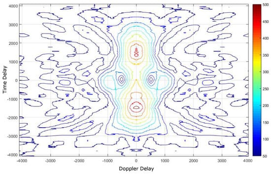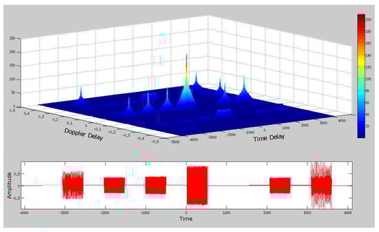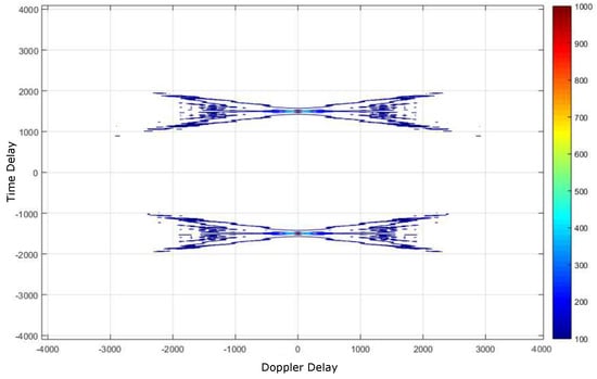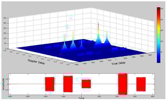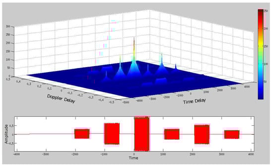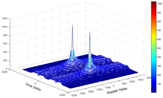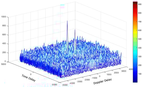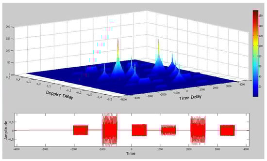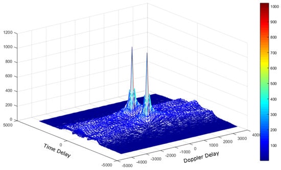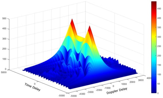 The scattering interaction among the designed waveforms utilized at the transmitters was addressed using multidimensional, multi-component, polynomial phase (MMPP) signals and the processing of these signals using discrete Cohen distributions (DCDs) under a bidimensional harmonic analysis setting. In particular, the efficient computation of cross-ambiguity function operations was instrumental in solving the multiple objects scattering problem. Figure 10, Figure 11, Figure 12, Figure 13, Figure 14, Figure 15, Figure 16, Figure 17, Figure 18, Figure 19, Figure 20, Figure 21, Figure 22 and Figure 23 show the result of our bidimensional harmonic analysis algorithm applied to two nearby scatterers when these scatterers get closer. The bidimensional harmonic analysis was conducted using a diverse set of designed waveforms, including, sinusoidal, square and linear modulation or “chirp” pulses. The results showed, as expected, that the bidimensional harmonic analysis using chirp waveforms outperforms the analysis conducted using square waveform pulses.