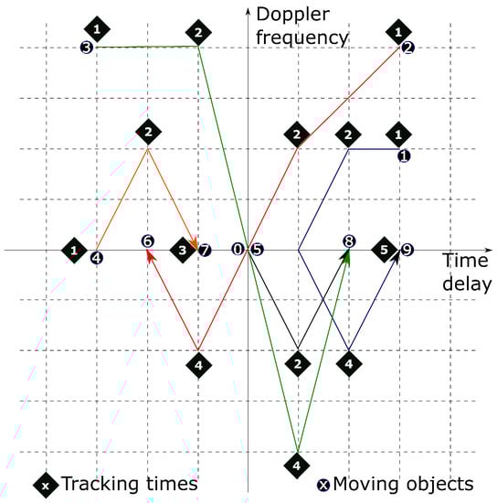 In this section, we describe a generalized testbed algorithm framework for simulating the tracking of multiple objects moving at a constant speed in a deep underwater environment. Figure 24 presents a tracking allocation chart when the number of tracked objects is equal to ten (10). However, the testbed algorithm framework was tested under multiple object tracking scenarios, each tracking scenario producing a different tracking allocation chart. Figure 25, Figure 26, Figure 27, Figure 28, Figure 29, Figure 30, Figure 31, Figure 32, Figure 33 and Figure 34 show the performance of the ten-object tracking simulation example. For simplicity, the chirp pulse waveforms were normalized in the amplitude and were also time normalized by setting the sampling time equal to unity.