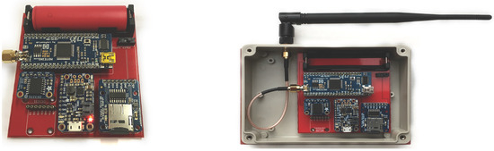 Custom-built LoRa platform based on the Moteino MEGA (LowPowerLab, Canton, MI, USA) inside a water-proof enclosure (top removed) [41].