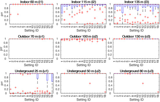 Packet reception ratio prr, i.e. the fraction of transmitted packets that are successfully received, for different distances, scenarios, and physical (PHY) settings (setting ID). Horizontal red lines represent the median, while blue boxes represent the 25th and 75th percentiles. The remaining results are enclosed by vertical dashed black lines while statistical outliers are represented by red crosses. Each node is positioned according to Figure 1.