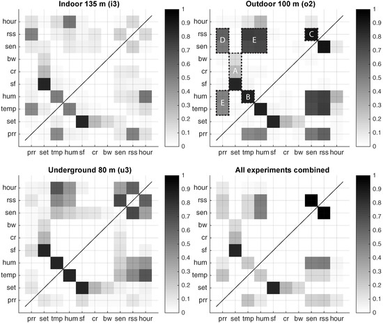 Figure 4 shows that, in all three scenarios (indoor, outdoor and underground), there are some obvious correlations. First (A), the setting ID depends on the bandwidth, coding rate (cr), and spreading factor (sf). This is to be expected, because the setting ID unequivocally describes a combination of these three PHY parameters. Second (B), temperature (temp) is highly correlated with humidity (hum) and both are correlated with the time of the day (hour). This is also an expected correlation, as these environmental factors are highly dependent on the sun exposure. Third (C), the radio sensitivity (sen) is correlated to the received signal strength (rss), since the former is defined as the minimum of the latter. Furthermore, one can also note in Figure 4 that the received signal strength (rss) is correlated with the packet reception ratio (prr) (D), as the LoRa radio is able to successfully decode packets that are above a certain signal-to-noise ratio.