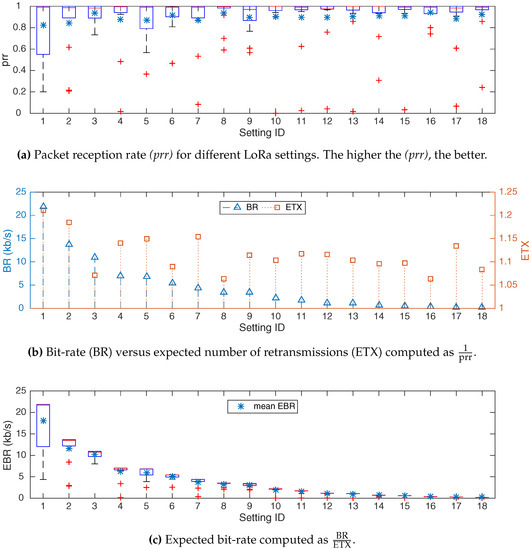 The EBR shows the expected bit-rate of each setting in the case packets are re-transmitted back-to-back until one is successfully received. As we can see from Figure 5c, the mean EBR is by far the highest when the fastest LoRa setting is used (setting ID 1). Setting ID 2, on the other hand, is more consistent, showing a lower variance and the highest minimum (crosses represent outliers).