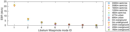 To test the validity of this claim, we additionally compute the EBR for 12 experiments run by independent researchers [5] and present the results in Figure 6. The experiment was run on several Libelium Waspmote LoRa motes; therefore, the setting ID shown in the figure (mode ID) is enumerated according to the Libelium application programming interface (API). As for Figure 5, we conveniently order the PHY settings starting from the one using the highest bit-rate on the left, to the one employing the lowest bit-rate on the right. As we can see, this set of experiments also confirms our observation: faster settings result in higher bit-rates, even though the quality of the link (i.e., the (prr)) is lower.