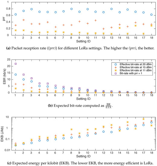 Figure 7c shows the energy required by each PHY setting to transmit a kilobit of data (EKB), including the cost of the re-transmissions. As we can see, the most efficient transmission power configuration (i.e., leading to the lowest EKB) is the highest, i.e., +20 dBm. Therefore, our experimental results suggest that, together with the fastest setting, the highest transmission power should be preferred: this combination provides the highest bit-rate EBR and the lowest energy consumption EKB. It is worth highlighting that, in less challenging scenarios in which several transmission powers achieve a prr = 1, the lowest one should be used, as the higher transmission powers may increase the energy consumption without any additional benefit.