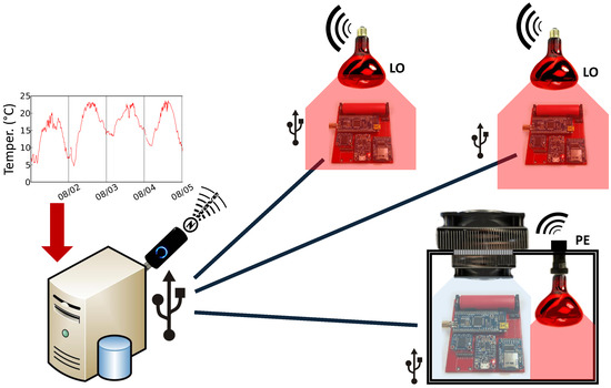 Experimental setup. We use the TempLab testbed [39] to expose a number of LoRa nodes to repeatable temperature variations as shown in Figure 8. The TempLab testbed available at Graz University of Technology has two different types of nodes [38]: LO nodes only heating the sensor nodes above room temperature and PE nodes having the capability to also cool down the node’s temperature below zero degrees thanks to enclosures made of hard Polystyrene foam and ATA-050-24 Peltier air-to-air assembly modules (Custom Thermoelectric, Bishopville, MD, USA). Both LO and PE nodes are remotely controlled using an Aeon Z-Wave Stick Series 2 (Aeon Labs LLC, El Cerrito, CA, USA) sending commands to (i) Vesternet EVR_AD1422 Z-Wave Everspring wireless dimmers (Smartech Holdings Ltd., Manchester, UK) connected to Philips E27 infra-red 100 W light bulbs (Philips, Eindhoven, The Netherlands) and (ii) to Vesternet EVR_AN1572 Z-Wave Everspring on–off wireless switches connected to the Peltier modules.