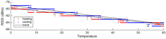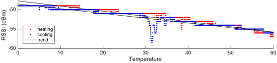 Also according to [18], we observe an hysteresis in the relationship between RSSI and temperature when comparing the curves obtained when heating and when cooling the LoRa nodes. Similarly, Figure 10 shows the relationship between RSSI and temperature recorded when exposing ST Nucleo L073RZ boards (STMicroelectronics, Geneva, Switzerland) [9] equipped with a Semtech SX1272 radio to temperature variations. Also using this hardware, we observe a linear decrease of about 6 dB in the RSSI at high temperatures. We attribute the spikes recorded on the experiment of Figure 10 (when temperature varies between 30 and 40 °C) to a temporary multi-path fading effect of the environment. Note that Figure 9 and Figure 10 refer to different experiments, both carried out using setting ID 6 (i.e., CR = 4/5, SF = 7, BW = 125 MHz).