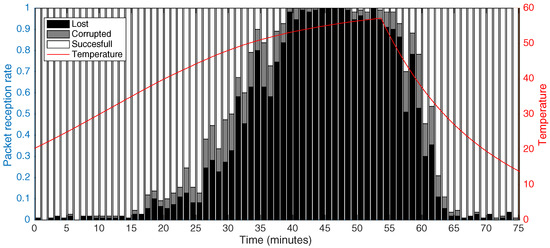 Impact on packet reception ratio. We further analyze the effects of temperature variations on nodes that are at the edge of their communication range. We intentionally place two nodes at the limits of their communicating range and slowly change the temperature of the transmitter from 15 to 60 °C and quickly back to 15 °C. Figure 11 shows the distribution of lost, corrupted and successfully received packets for every minute in a 75-min experiment. We can observe that what was a perfect link at minute 0 (100% prr at 15 °C) slowly becomes unusable at higher temperatures. As soon as temperature (red line) starts to increase, either packets are received, but their content is corrupted, or the radio was unable to receive the packet at all. Once temperature starts decreasing again, the link is restored and sustains a high delivery rate. These experiments confirm results from previous studies on specific IEEE 802.15.4 radios [18,19], and show that temperature can drastically affect packet delivery. An important takeaway message is that LoRa nodes employing the radio transceivers used in our experiments should be deployed during the warmest time of the day or year, to ensure that network performance is sufficient throughout the system lifetime, and that nodes should be shielded from sunlight if possible.